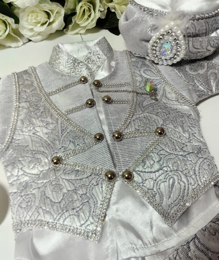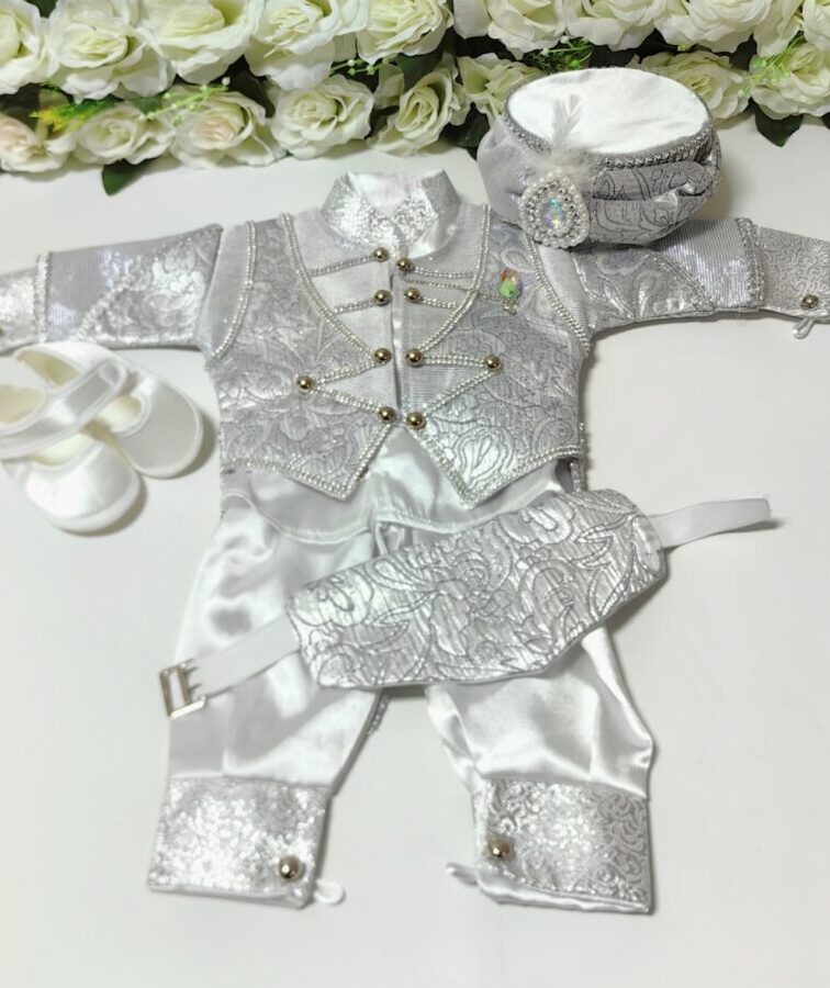 Комплектът съдържа: панталон, сако, риза, пояс, шапка и обувки.
