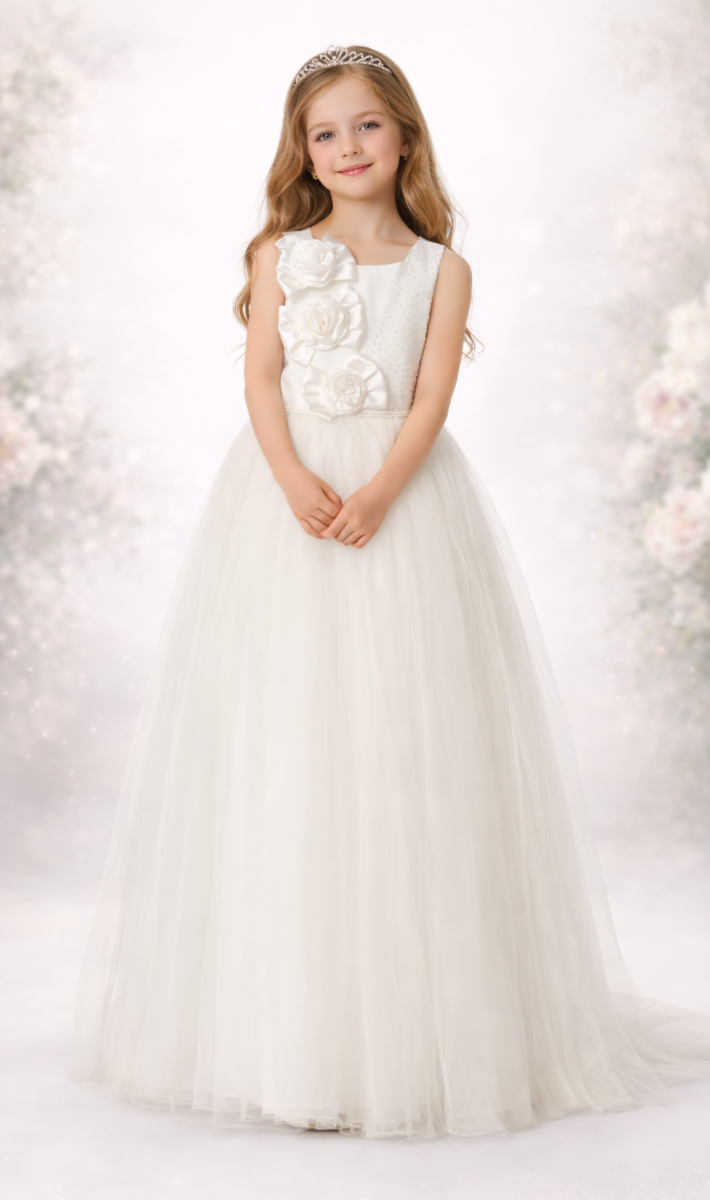Нежна и изискана рокля, създадена за малки принцеси и специални поводи. Горната част е изработена от фин сатен с деликатни перлени акценти и ефектни 3D цветя, които придават романтично и запомнящо се излъчване. Гърба е с ластичен сатен и сатенена панделка..