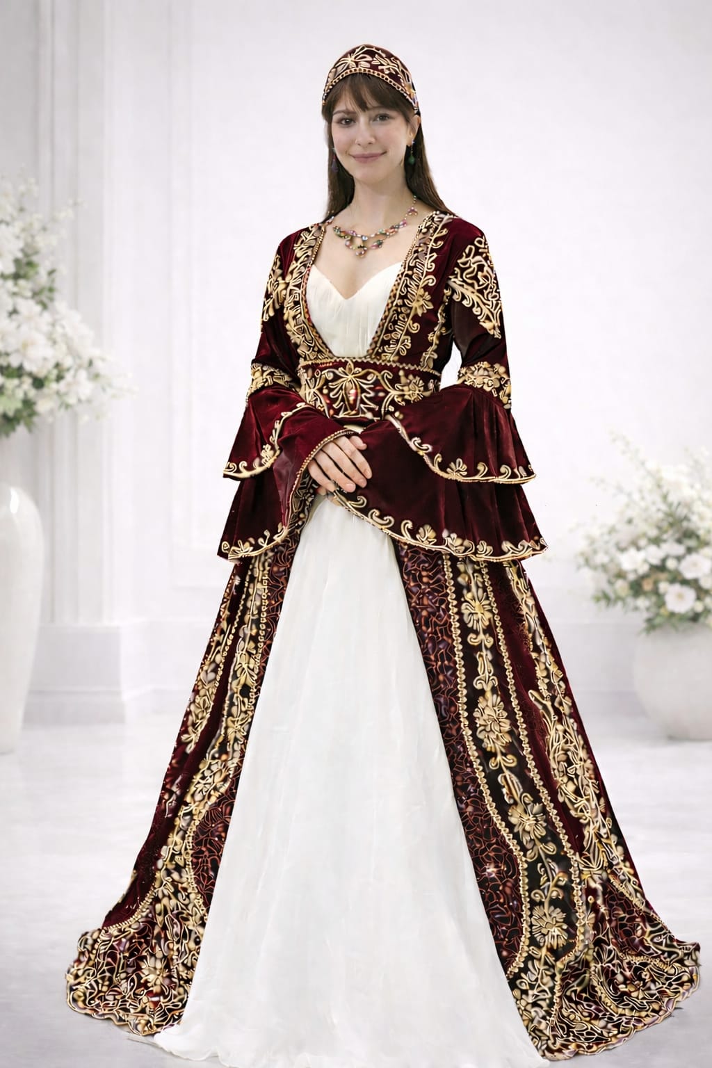 Кафтан за къна от плътно кадифе, със златисти нашити орнаменти и камъни. В комплект с корона, колие и колан от същата материя.