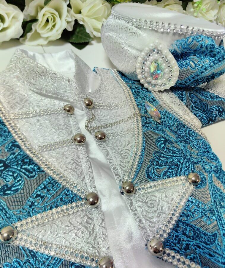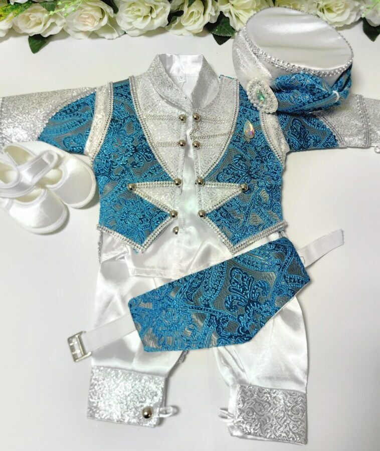 Комплектът съдържа: панталон, сако, риза, пояс, шапка и обувки.
