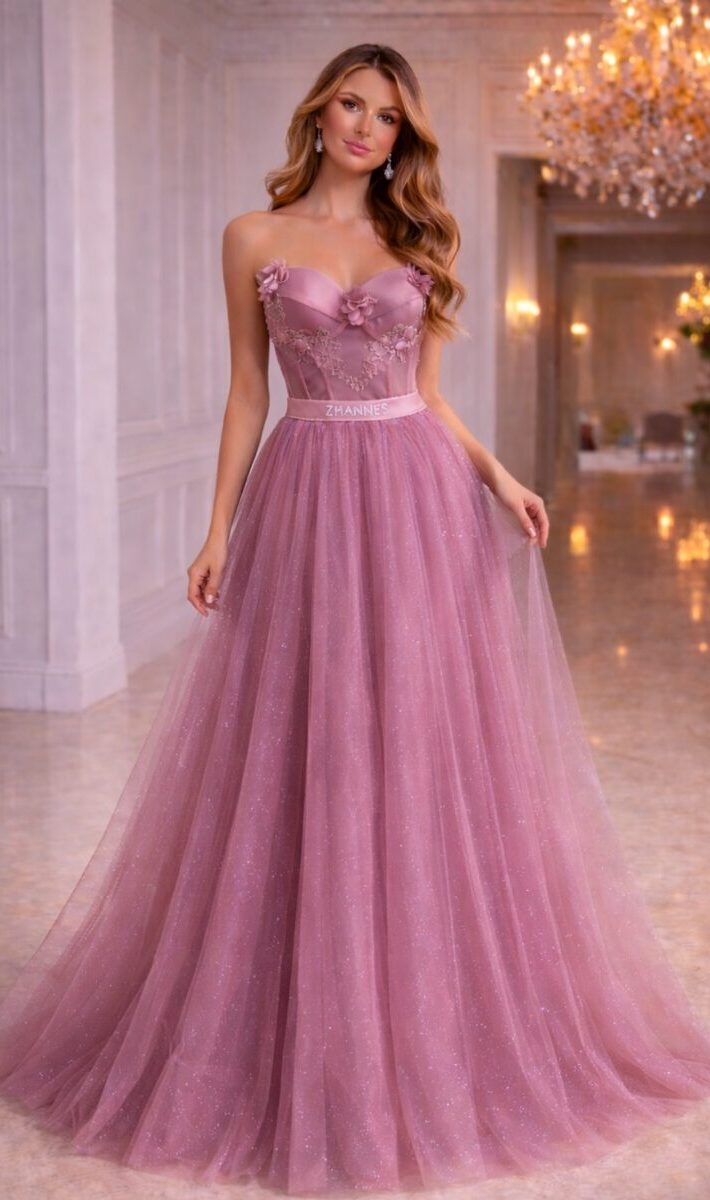 Моделът впечатлява с изискан корсет тип sweetheart, декориран с нежни 3D флорални елементи на предната част и на гърба и фина дантела отпред, които подчертават женствената линия на бюста. Талията е акцентирана със сатенен колан с кристално лого ZHANNES, придаващ завършен и луксозен вид.